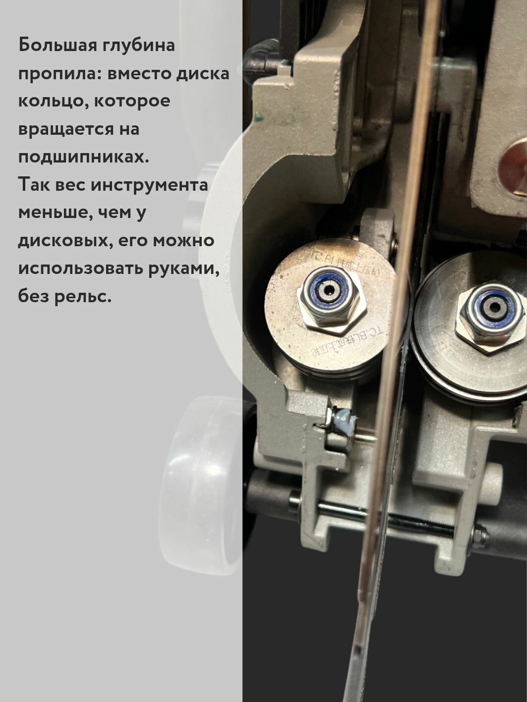 Большая глубина пропила: вместо диска кольцо, которое вращается на подшипниках. Так вес инструмента меньше, чем у дисковых, его можно использовать руками, без рельс.