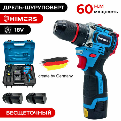 Купить Бесщеточный шуруповерт HIMERS DF60В-BL аккумуляторный 18V, 2 АКБ по 3 А. ч, 60 Н. м, кейс сталь с доставкой по всей России.