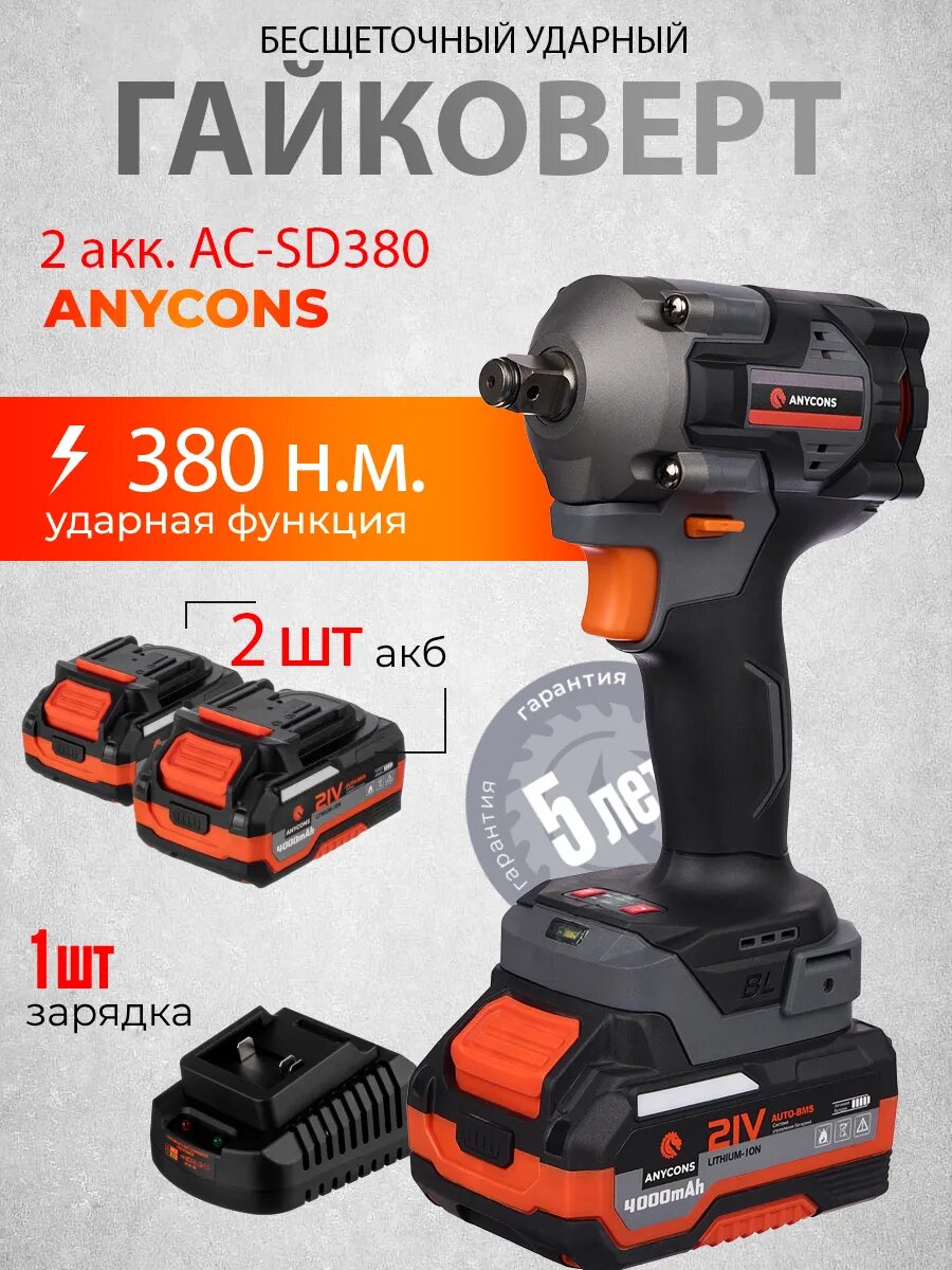 Купить Бесщеточный ударный гайковерт Anycons AC-SD-380, 380Нм, 21В, 2 акб, AC-SD3802 с доставкой по всей России.