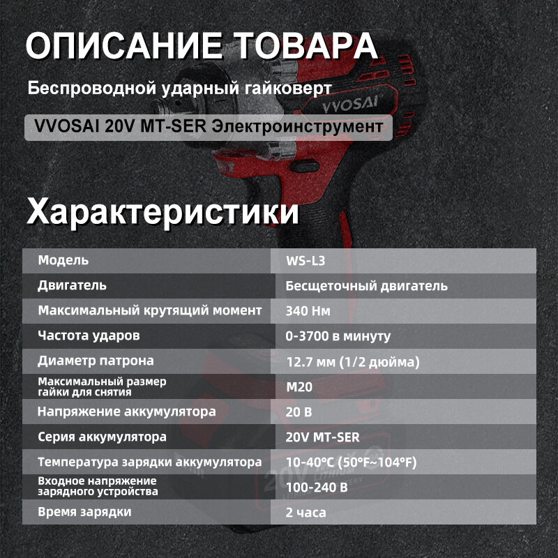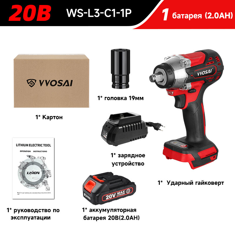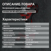 Бесщеточный ударный гайковерт VVOSAI WS-L3-C1-1P, 20 В 340 Нм, 1 аккумулятор 2,0 Ач, розетка: сравнение цен, характеристики, фото, актуальное наличие и цены.