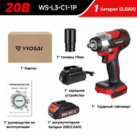 Купить Бесщеточный ударный гайковерт VVOSAI WS-L3-C1-1P, 20 В 340 Нм, 1 аккумулятор 2,0 Ач, розетка с доставкой по всей России.