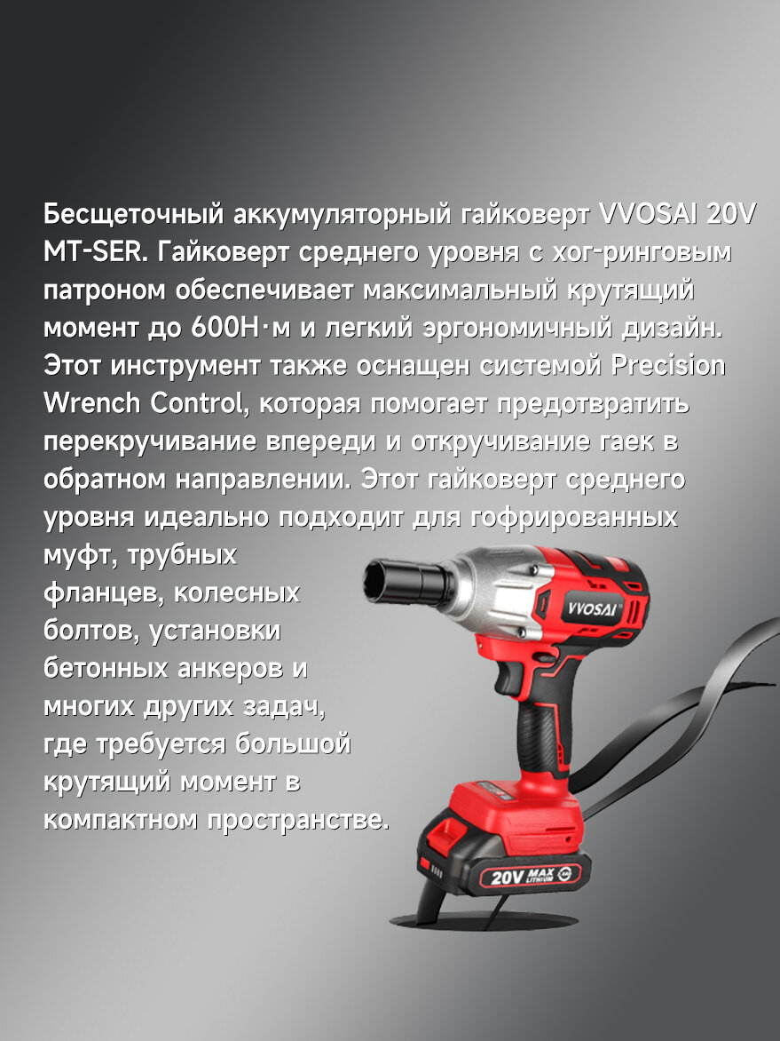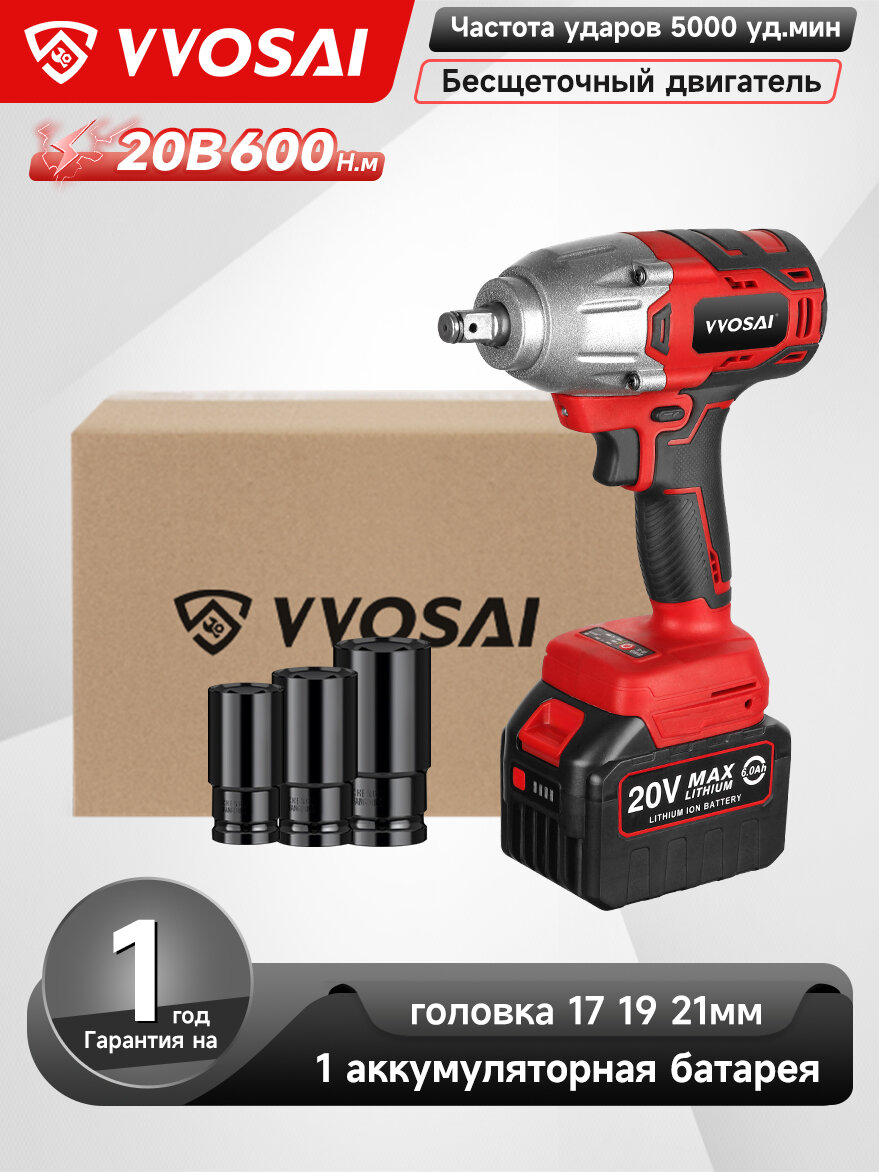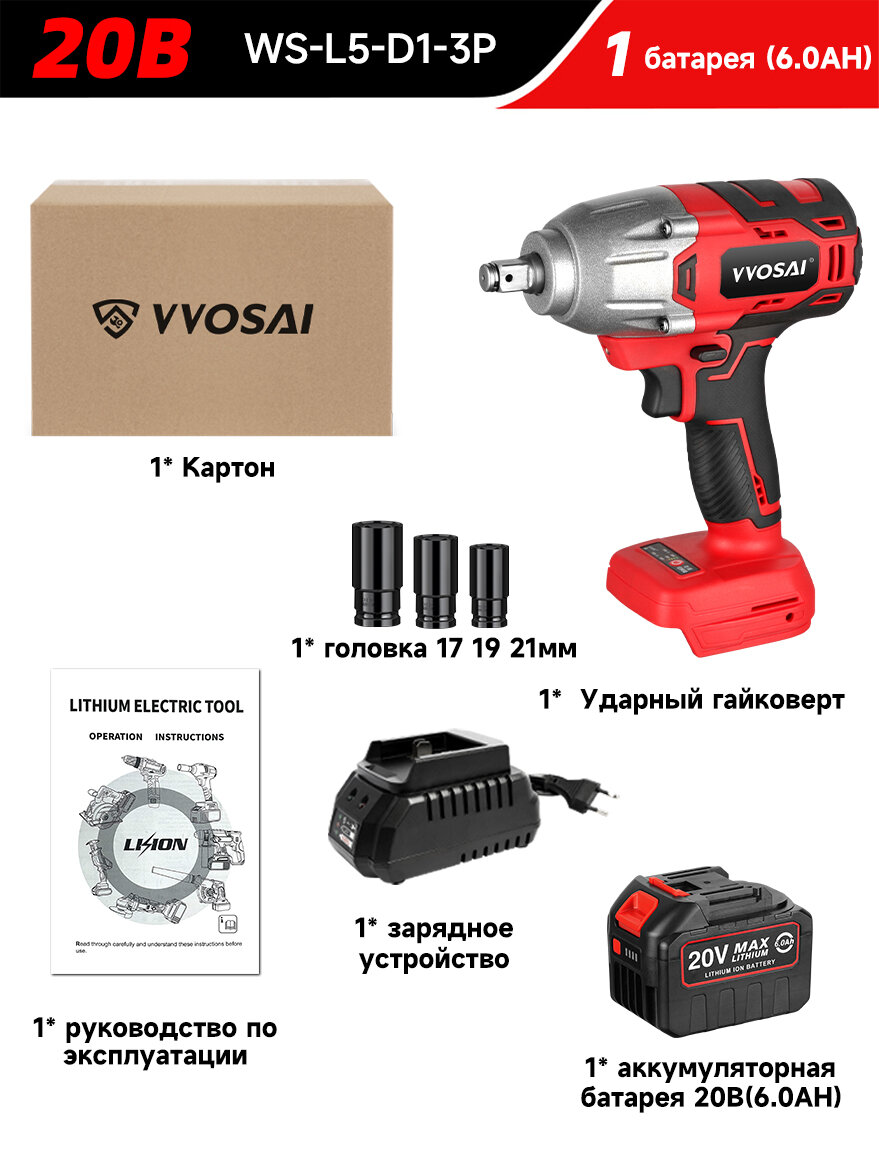 Бесщеточный ударный гайковерт VVOSAI WS-L5-D1-3P, 20 В 600 Нм, 1аккумулятор 6,0 Ач, торцевой ключ: сравнение цен, характеристики, фото, актуальное наличие и цены.