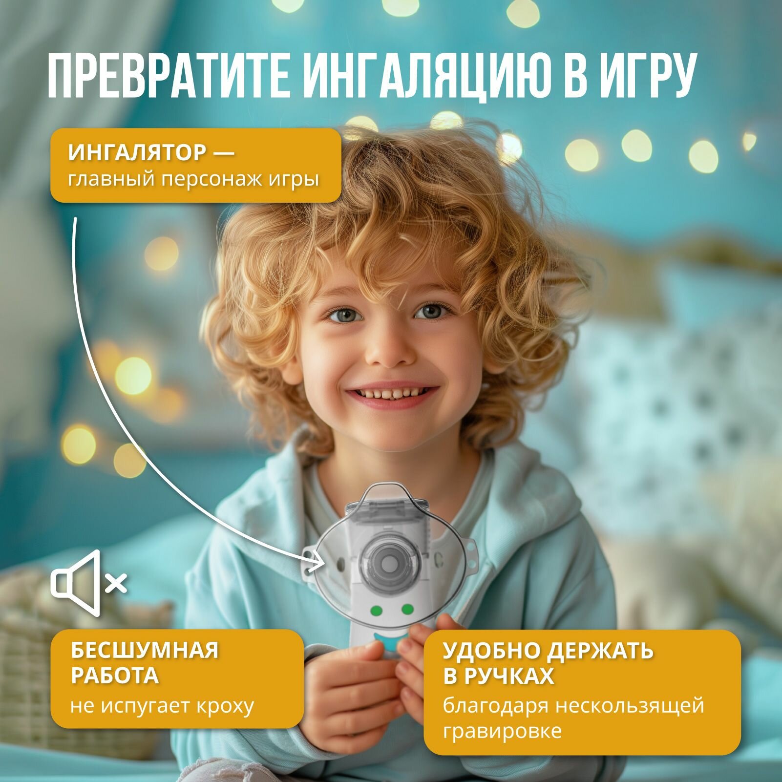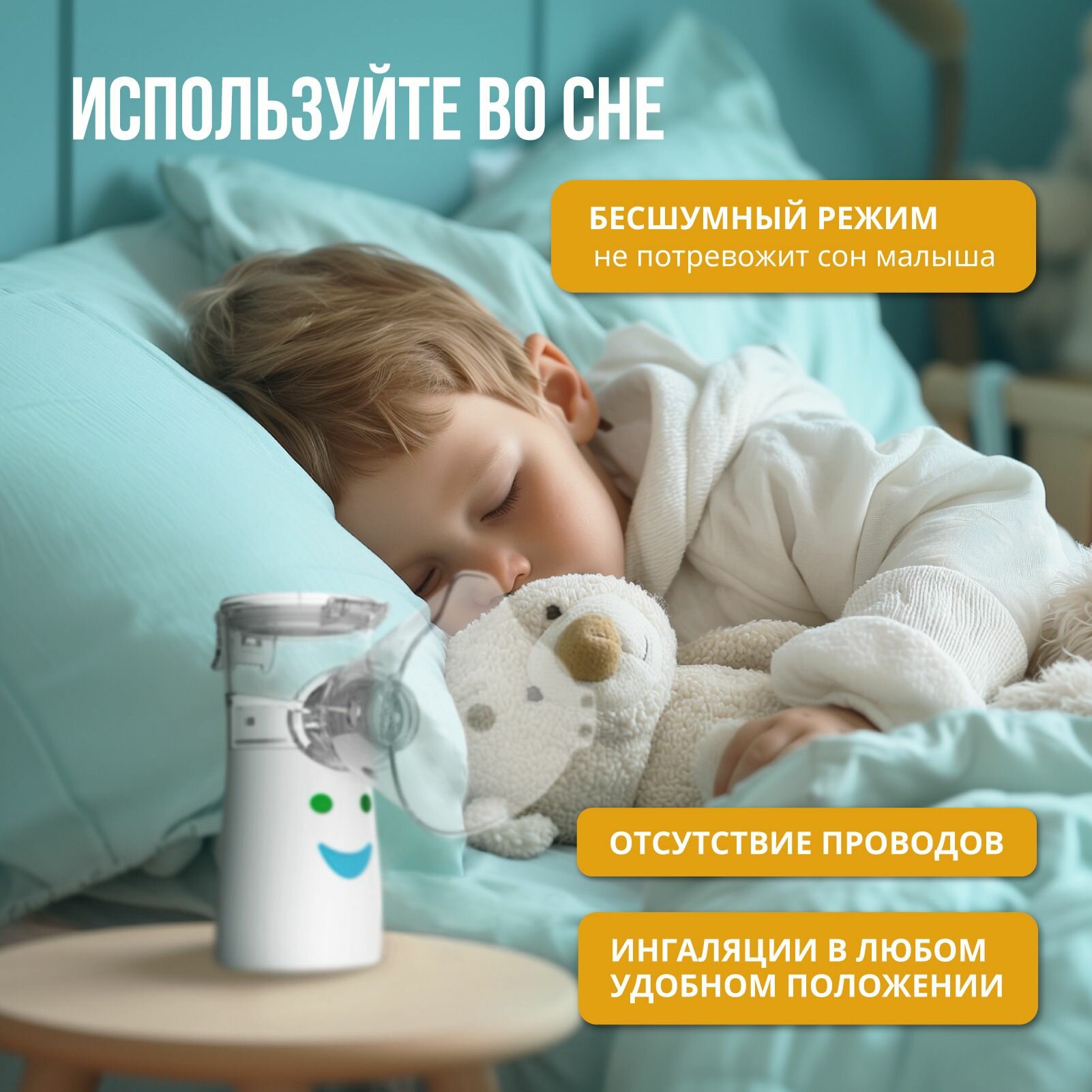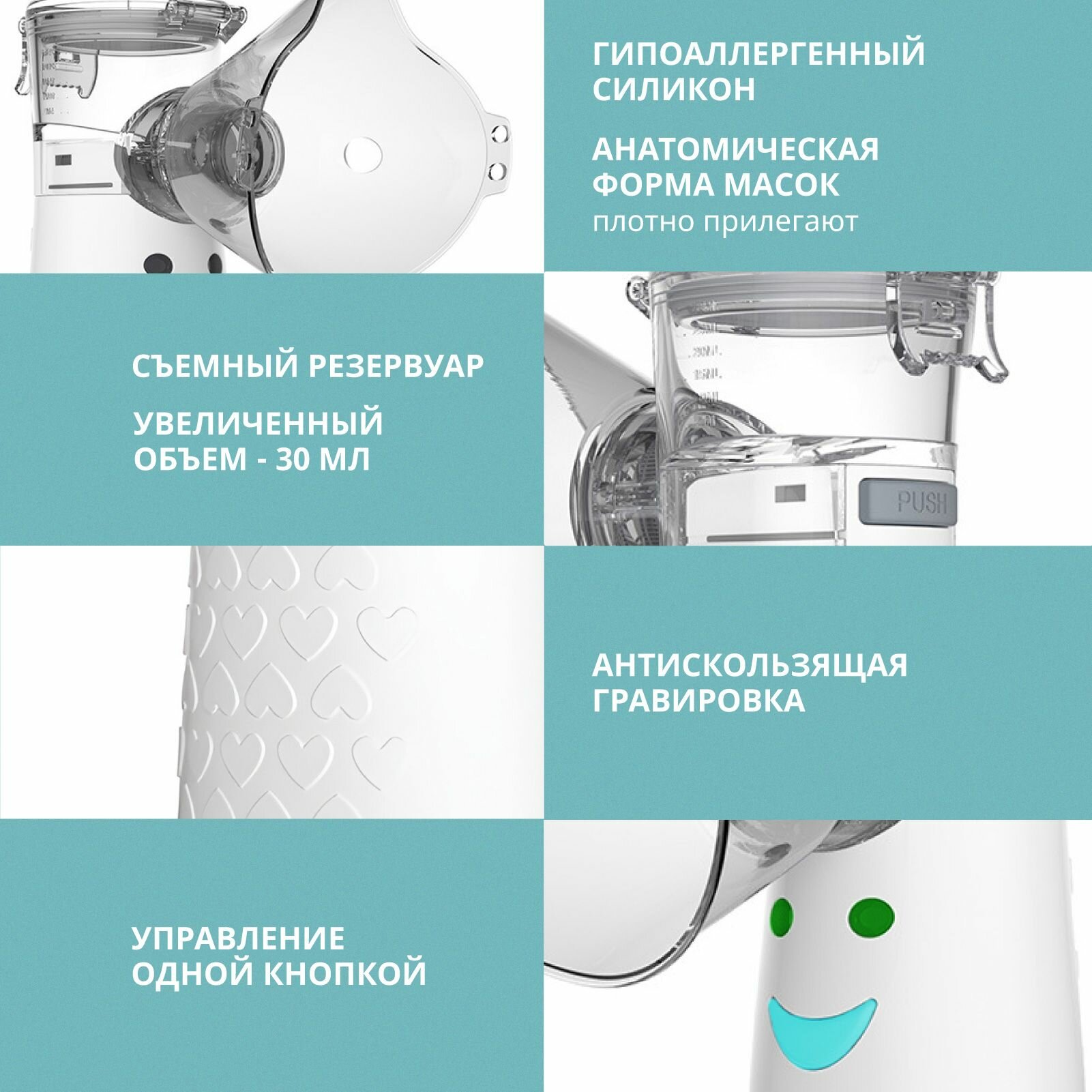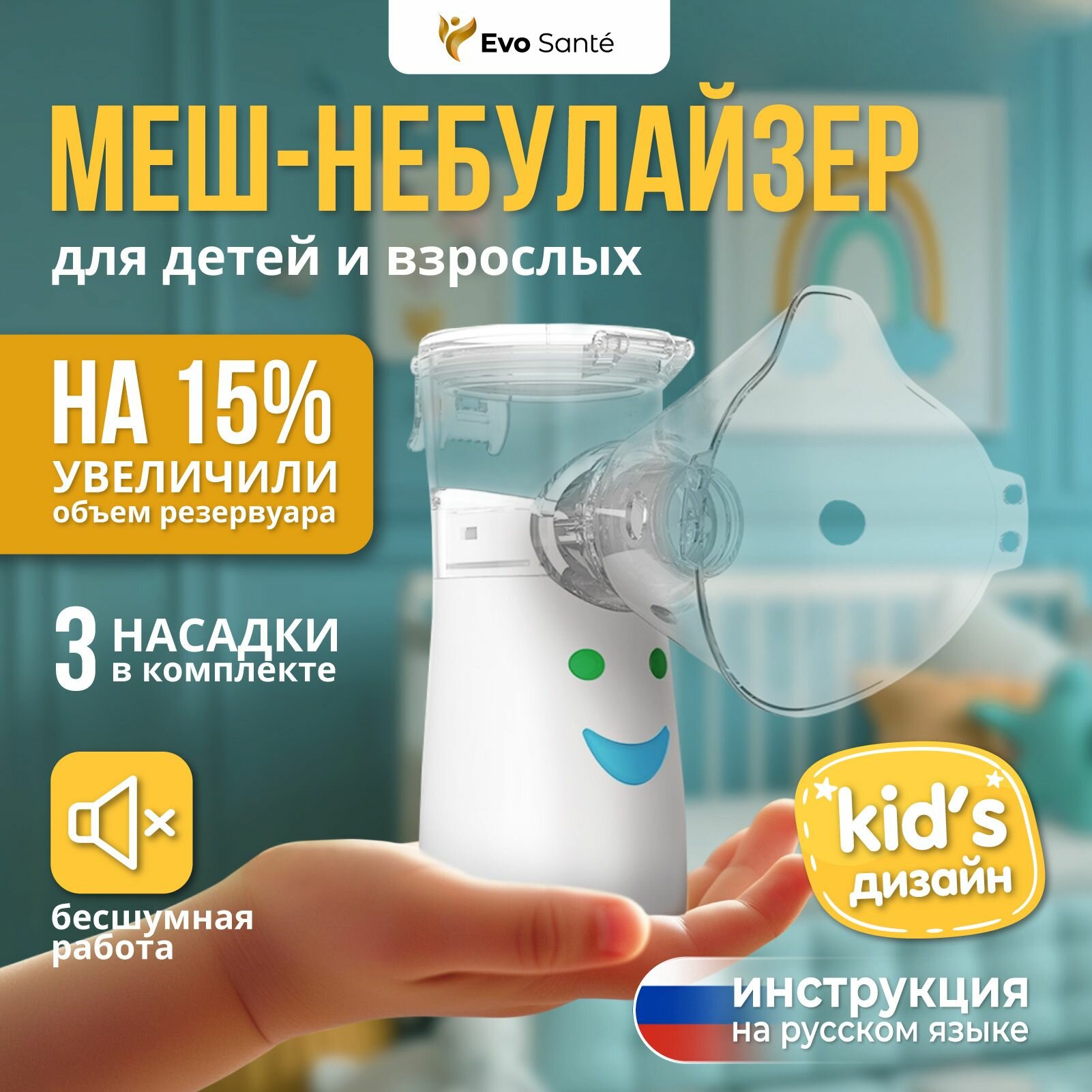 Купить Меш-небулайзер портативный. Небулайзер детский. Ингалятор для детей Evo Sante, 30 мл, 3 насадки, наклейки с доставкой по всей России.