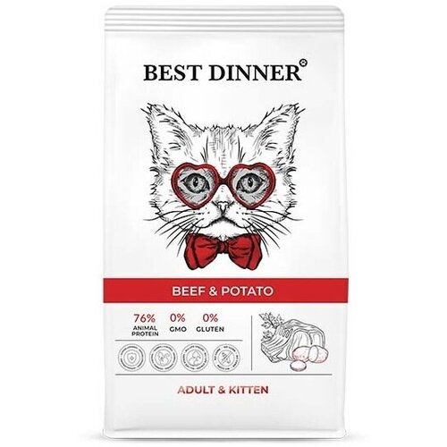 Две пачки корма Высококачественный полнорационный корм для кошек Best Dinner с говядиной и картофелем, создан с учетом физиологических потребностей кошек и котят. Вкусная говядина богато необходимыми аминокислотами для здоровья питомца и правильного роста котят. Клюква и DL - метионин, добавленные в рецептуру профилактируют мочекаменную болезнь, а юкка Шидигера прекрасно подойдет для вывода шерсти и устранения неприятных запахов из лотка. Гранулы в форме сердечек не оставят равнодушными даже самых привередливых кошек.