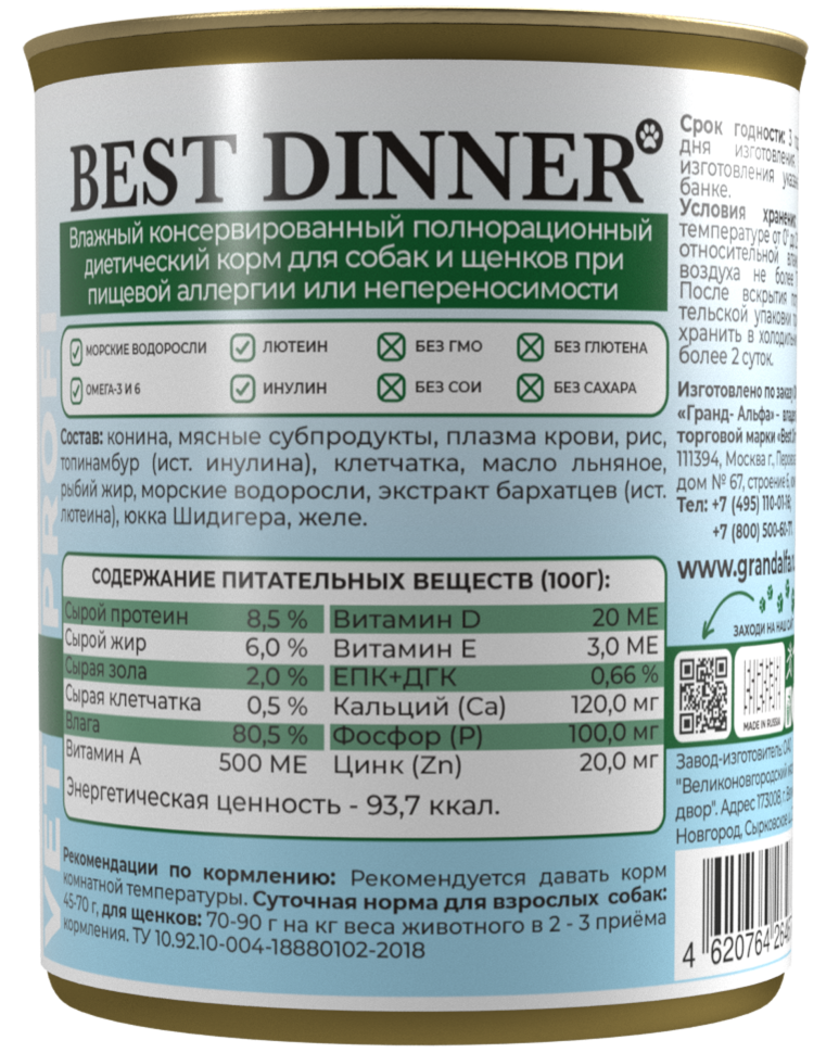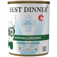 Best Dinner Exclusive Hypoallergenic консервы для собак при проблемах пищеварения с кониной и рисом — 340 г х 6 шт: сравнение цен, характеристики, фото, актуальное наличие и цены.