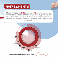 | Пищевая ценность | Содержание питательных веществ ( 100г): сырой протеин – 9%; сырой жир – 4%; сырая зола – 1,5%; углеводы – 2,2%; клетчатка – 0,2%; таурин – 0,2%; влажность – 83,6%. |
