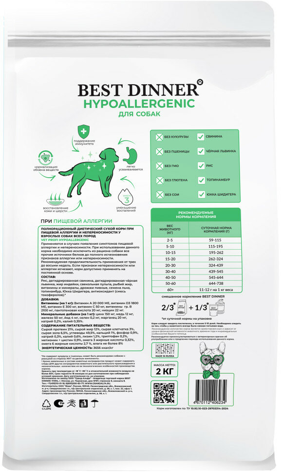 Купить Best Dinner Vet Profi Hypoallergenic сухой корм для собак при пищевой аллергии и непереносимости — 2 кг с доставкой по всей России.