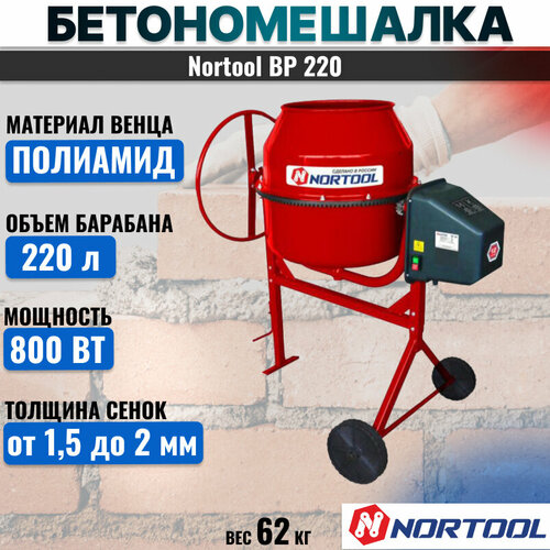 Бетономешалка Nortool BP 220, полиамидный венец - простое в обслуживании, надёжное строительное оборудование для перемешивания растворов.