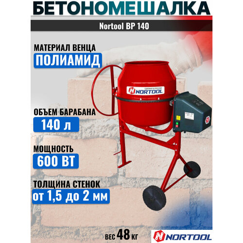 Бетономешалка Nortool BP 140, полиамидный венец - простое в обслуживании, надёжное строительное оборудование для перемешивания растворов.
