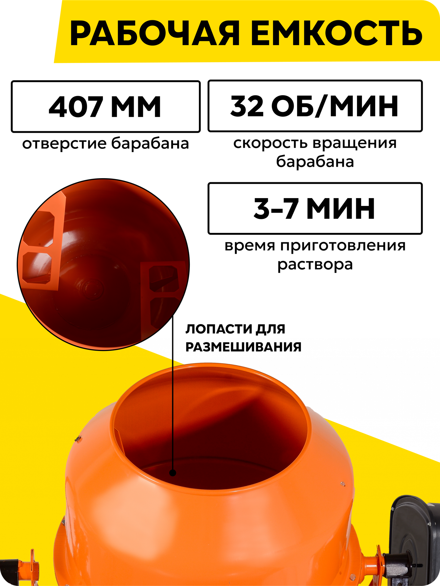 | Дополнительная информация | 1. Корпус с электродвигателем – 1 шт. 2. Барабан нижний – 1 шт. 3. Барабан верхний – 1 шт. 4. Стойка рамы – 3 шт. 5. Лопасти – 2 шт. 6. Наклонное колесо – 1 шт. 7. Диск-фиксатор угла наклона – 1 шт. 8. Колесо транспортировочное – 2 шт. 9. Комплект крепежей (винт/шайба/гайка) - 1 шт. 10. Инструкция по эксплуатации – 1 экз. |