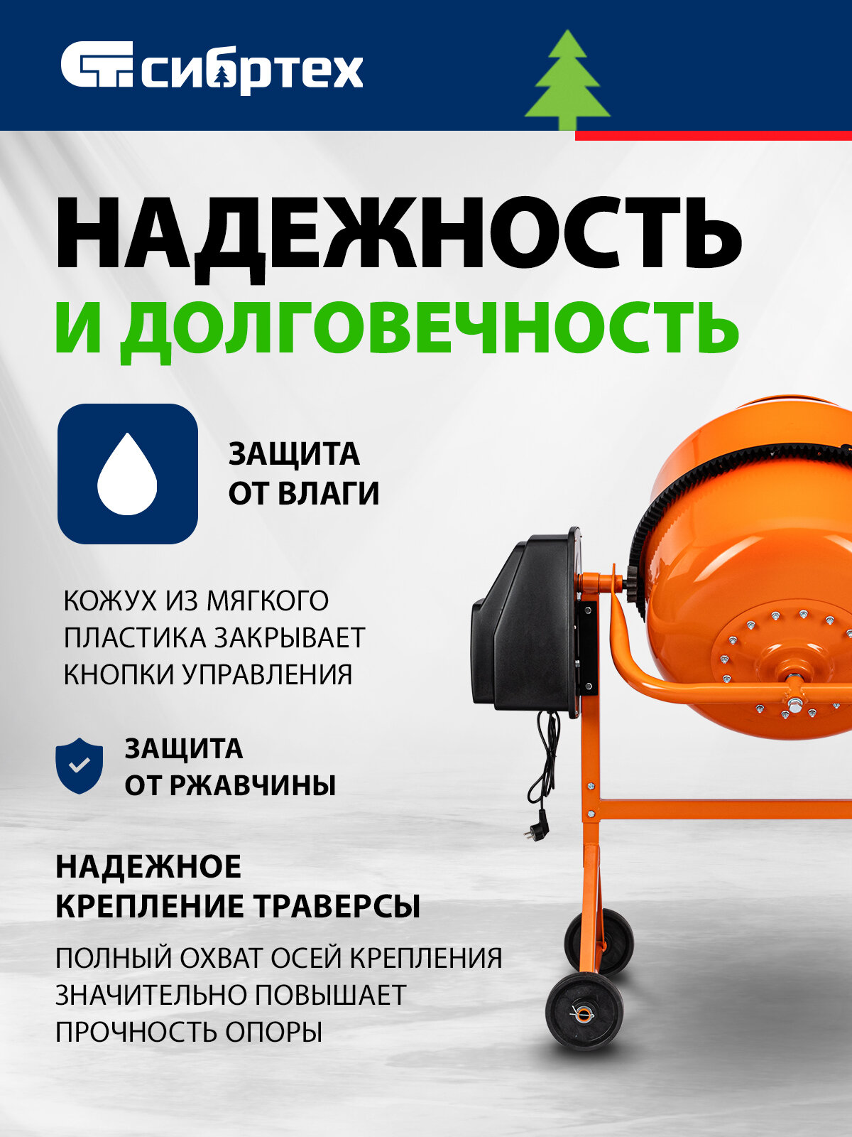Двигатель мощностью 800 Вт обеспечивает высокую производительность, при этом не создает значительной нагрузки на электросеть. Бетоносмеситель пригодится для проведения строительных работ небольшого объема.
