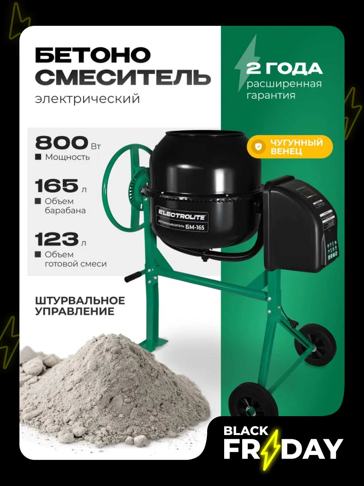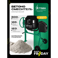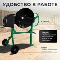 Мощный двигатель на 800 Вт обеспечивает стабильную работу и высокую производительность. Объем барабана составляет 165 литров, что позволяет приготовить до 120 литров готового раствора за один замес.