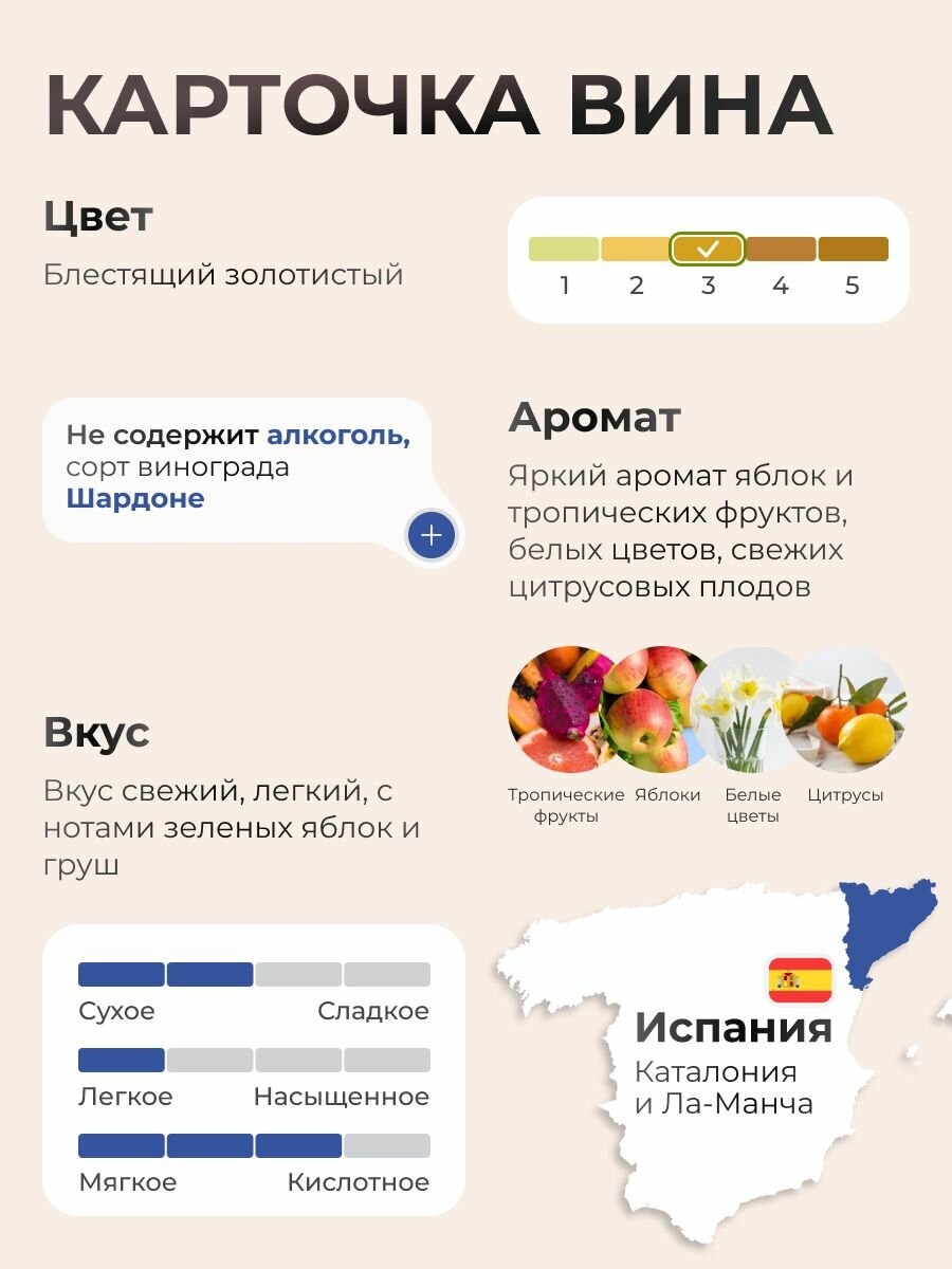 | Состав | деалкоглизированное вино, произведенное из свежего винограда Айрен, ректифицированное концентрированное виноградное сусло, натуральный ароматизатор - мускатель, стабилазтор Е-466, консерванты Е-220, Е-202, Е-242. Содержание сахара 64 г/л |