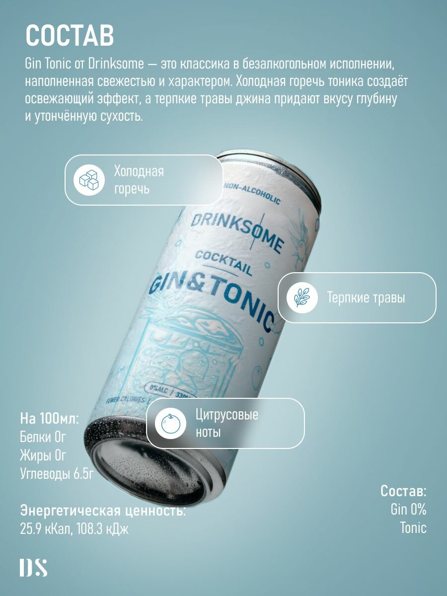 Купить Безалкогольный коктейль Джин Тоник Drinksome Gin&Tonic, лимонад без сахара газированный напиток, 8 шт с доставкой по всей России. Безалкогольный коктейль Джин Тоник Drinksome Gin&Tonic, лимонад без сахара газированный напиток, 8 шт: сравнение цен, характеристики, фото, актуальное наличие и цены.