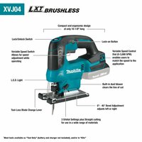 Бесщеточный лобзик Makita 18V LXT® (модель XVJ04Z, только инструмент, аккумулятор и зарядное устройство продаются отдельно) органично сочетает в себе точность и мощность с эффективностью бесщеточного инструмента в более компактном дизайне. XVJ04Z спроектирован так, чтобы обеспечить мощность и производительность сетевого лобзика, но без проблем, связанных со шнуром. Он идеально подходит для профессиональных столяров, специалистов по жилищному строительству и любого подрядчика, которому нужен лучший в своем классе аккумуляторный лобзик.