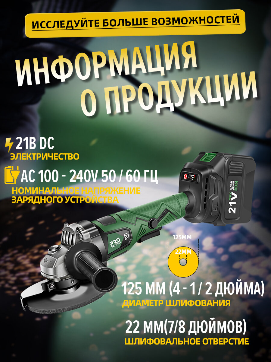 Продукт включает в себя: Бесщеточный электродрель * 1 Зарядное устройство * 1 Аккумулятор 4500 мАч * 1 125x1мм шлифовальная пластина * 1 125x6мм шлифовальная пластина * 1 Вспомогательные инструменты * 2