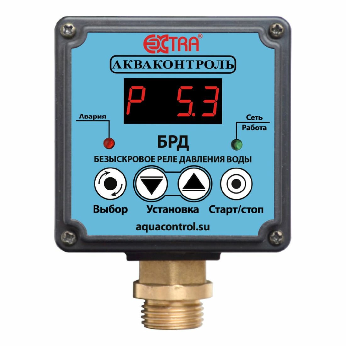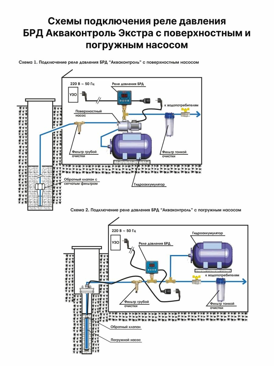 Безыскровое реле давления воды БРД-10-2.5 предназначено для автоматизации работы бытового электронасоса, мощностью Р1 не более 2.5 кВт, работающих в электрической сети с неискаженной формой напряжения. БРД включает насос в момент прохождения сетевого напряжения через ноль, а отключает его при минимальном фазном токе, что исключает коммутационные помехи в сети, которые неизбежно возникают при применении электромеханического или электромагнитного реле. Краткое описание функций: - включает и выключает насос при достижении соответствующих порогов давления - защита от сухого хода в режиме всасывания и в режиме расхода воды - защита от разрыва трубопроводов - защита от недобора давления - функция дельта - обнаруживает неисправность мембраны гидроаккумулятора - позволяет установить максимальное количество включения насоса в час - автоматический перезапуск после срабатывания защиты от сухого хода - режим полив - защита от работы насоса при минусовой температуре.