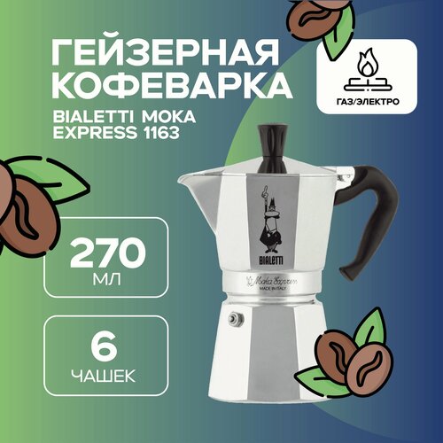 Отличный выбор! Гейзерная кофеварка Bialetti Moka Express на 6 чашек является одной из самых популярных и известных моделей на рынке. Эта кофеварка изготовлена из высококачественного алюминия и имеет классический дизайн Биалетти.