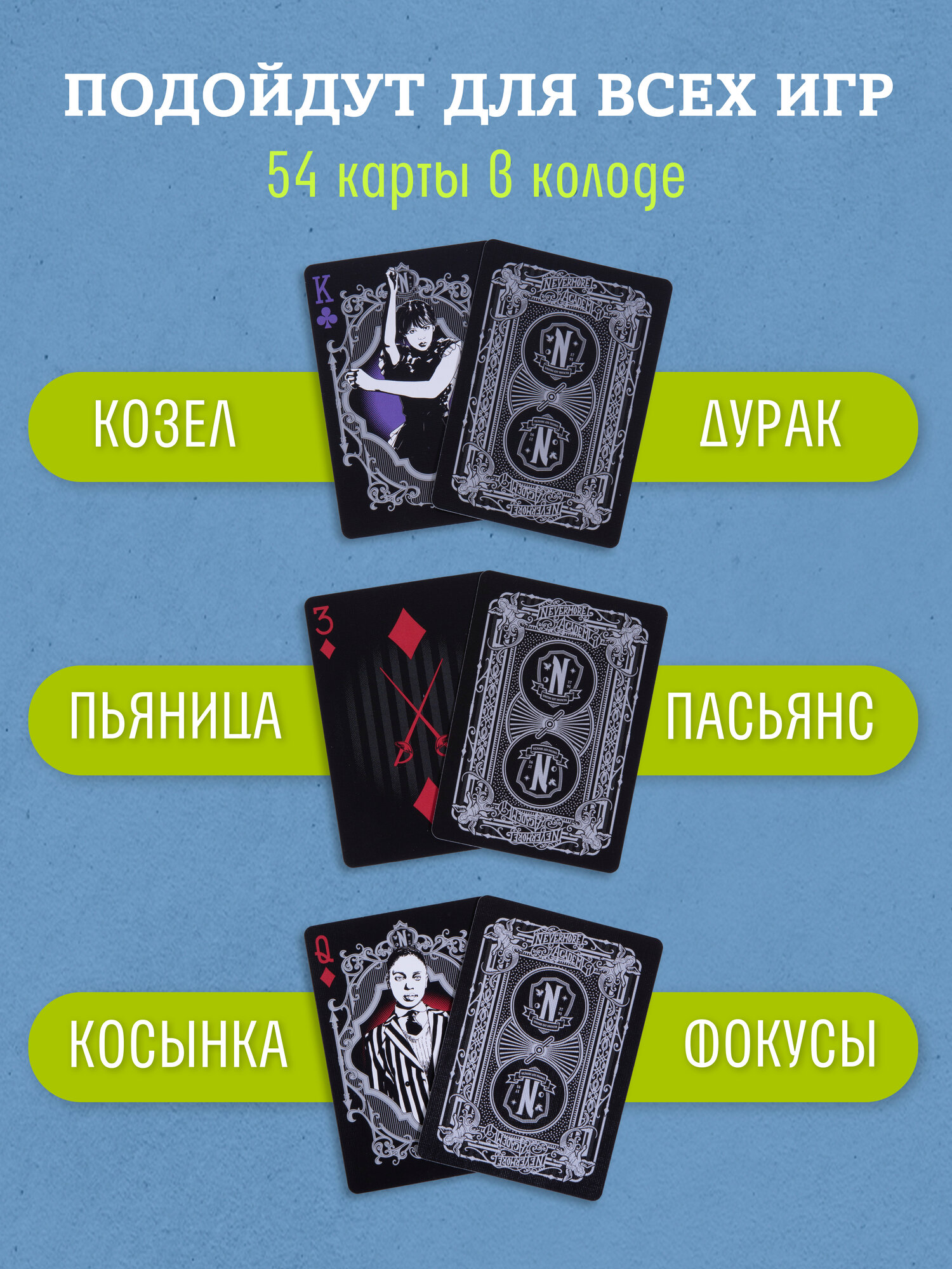 Элегантная коллекция игральных карт, вдохновленная уникальным стилем. В колоде 54 карты, выполненные в изысканном дизайне с тематикой Wednesday Addams и Семейки Аддамс. Каждая карта имеет матовое пластиковое покрытие, что обеспечивает долговечность и комфорт при использовании.
