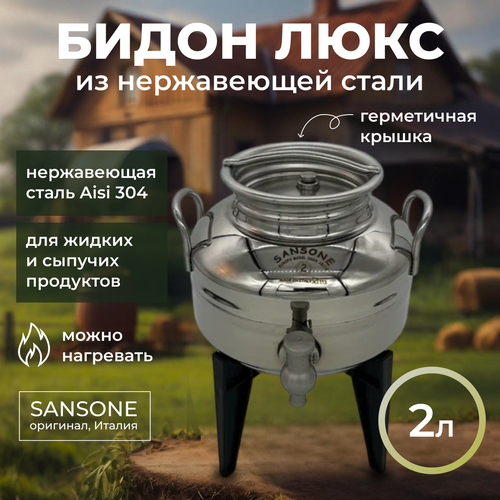 Бидоны sansone подходят для хранения и транспортировки воды, молока, вина, меда, кваса, пива, самогона и других жидкостей. Благодаря возможности нагрева на газовых и некоторых видах электроплит, фляга бидон может использоваться в домашних и производственных целях.