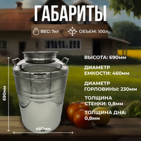 Бидон нержавеющая сталь 100 л может использоваться, как бродильная емкость. Благодаря своей конструкции, он легко устанавливается с гидрозатвором, что делает процесс брожения простым и эффективным. Кроме того, бидон отлично подходит в качестве перегонного куба для быстрого получения самогона, что делает его универсальным инструментом для домашнего виноделия и самогоноварения.