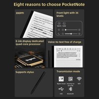 Технические параметры продукта:Продукт: Считыватель экрана электронных чернил Модель: Bigme PocketNote Размер дисплея: 7-дюймовый Тип экрана: черно-белый экран с электронными чернилами Передний фонарь: 36-уровневая регулируемая теплая и прохладная лампа для чтения. PPI: B/W: 300PPl Разрешение: B/W 1680*1264 Процессор: 4-ядерный 1,8 ГГц Оперативная память/внутренняя: 2 ГБ+32 ГБ Операционная система: открытая система Android 8.1. Возможности подключения: WIFI и Bluetooth Динамик: Поддержка Микрофон: Поддержка Свободный голос в текст Камера: Нет камеры Емкость аккумулятора: 3000 мАч Стилус: емкостный стилус. Габаритные размеры: 135,4*160*7 мм Размер экрана: 105,81*140,96 мм Вес: 223 гОбратите внимание, что две вышеуказанные версии отправляются случайным образом.Электронный экран для защиты глаз от укусаНе содержит синего света и бликов, экран четкий, как бумага.256-уровневый экран высокой четкости оттенков серогоИспользуя 16-уровневый алгоритм оттенков серого для имитации 256-уровневого эффекта оттенков серого, экран дисплея деликатный, границы четкие, а визуальное воздействие сильное.Считывает почти 20 различных форматов книгPDF TXT EPUB EPUB3 HTML HTM AZW AZW3 FB2 DOCX MOBI OEB CBZ CBR RPC RTF DJUV ZIPУниверсальный XReader повышает удовольствие от чтенияПозволяет рукописные заметки, анотации и т. д. Просматривайте документы в формате PDF с пятью вариантами обрезки.Удалите водяной знак с PDF-документа.Изменение размера и изменения шрифтаУвеличение и уменьшение масштаба двумя пальцами на сенсорном экране.Чтение с разделенным экраном может повысить эффективность работы.Делайте заметки во время чтения; Переводить во время чтенияПоддержка стилусаБесшовный почерк, подходящий для ведения дневника, письма или рисования, в соответствии с вашими потребностями.Шаблоны заметок, удобные для пользователя и эффективныеСинхронизация и передача данныхОблачная синхронизация гарантирует отсутствие потери данных. Несколько вариантов передачи данных облегчают обмен файлами. Большой облако| Совместное использование через QR-код| WIFI| USB| BluetoothОбзор воспроизведения звукаНажмите, чтобы прочитать, повысив эффективность записи встреч.