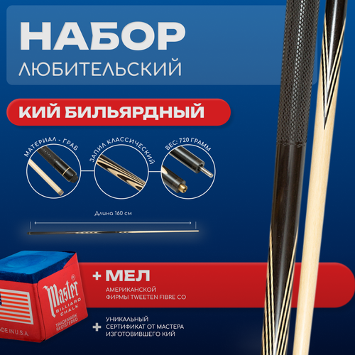 Бильярдный кий ручной работы от мастера Филатова выполнен из ценных пород дерева – черный и белый граб. 13 запилов обеспечивают равномерное распределение силы удара, что гарантирует высокую точность. Запилы также повышают надежность кия, предотвращая его искривления. Скрутка бильярдного кия выполнена из особых сплавов, благодаря которым при ударе он ведет себя как цельная модель. Кий идеально сбалансирован, а тонкий турняк комфортно ложится в ладонь. Этот кий для бильярда ручной работы не только порадует превосходным качеством, но и доставит вам настоящее удовольствие от игры. В комплекте с кием для бильярда идет мел от известного американского бренда Tweeten Fibre Co. Бильярдный мел «Мастер» идеально подходит для мягких и средних наклеек.