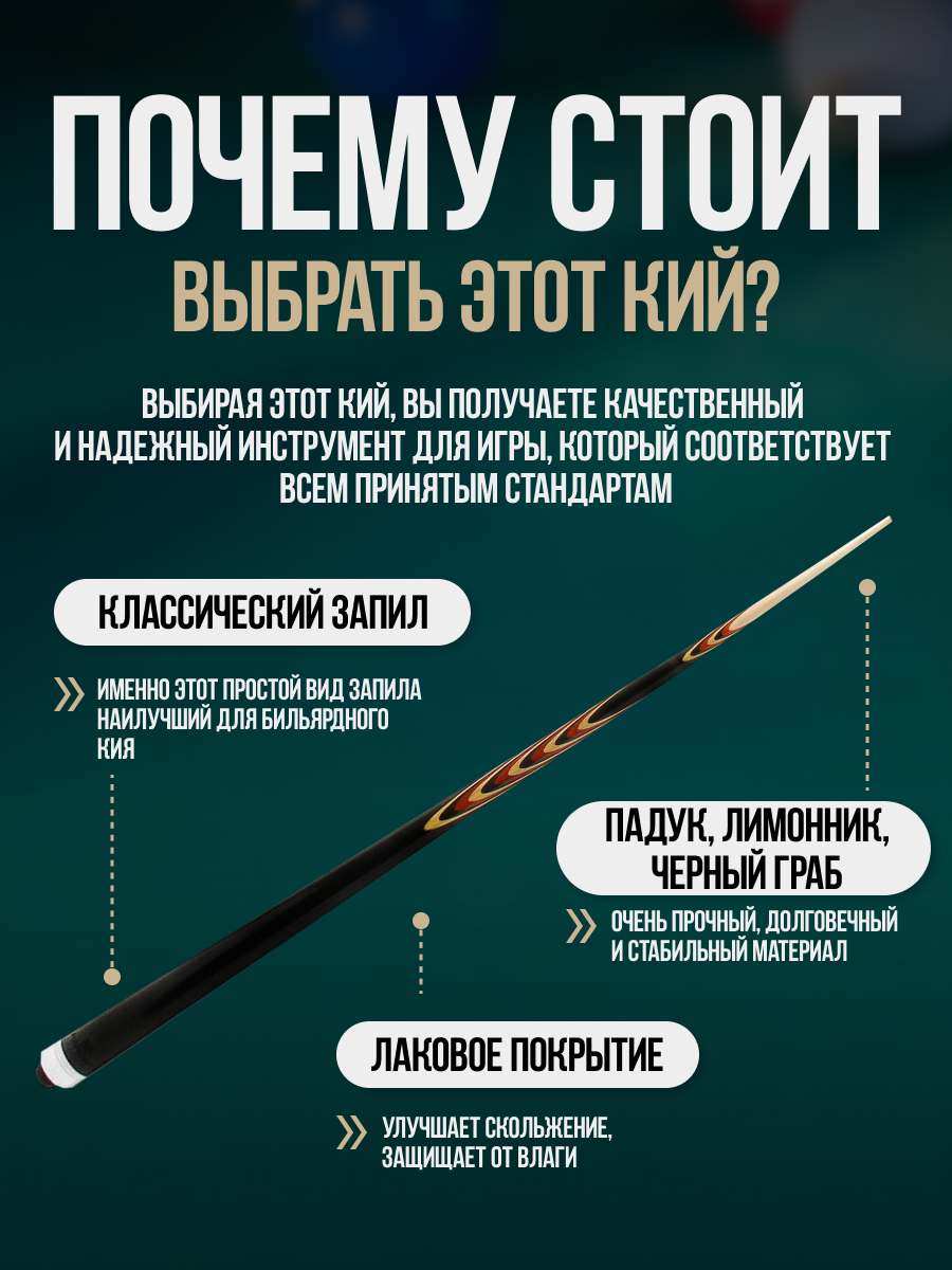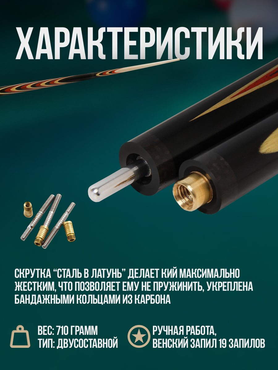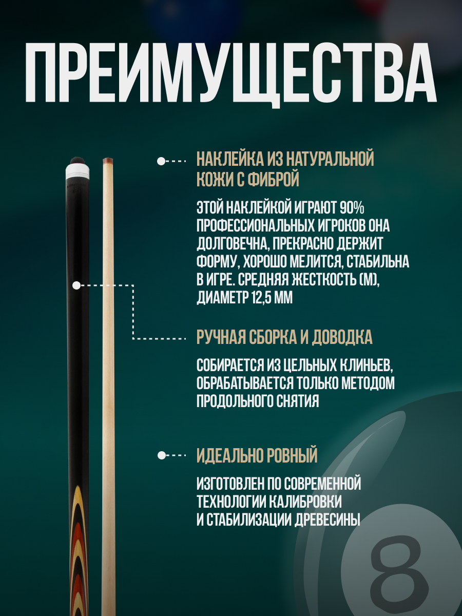 Конструкция кия двухсоставная, что обеспечивает его прочность и долговечность.