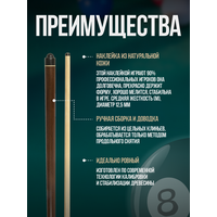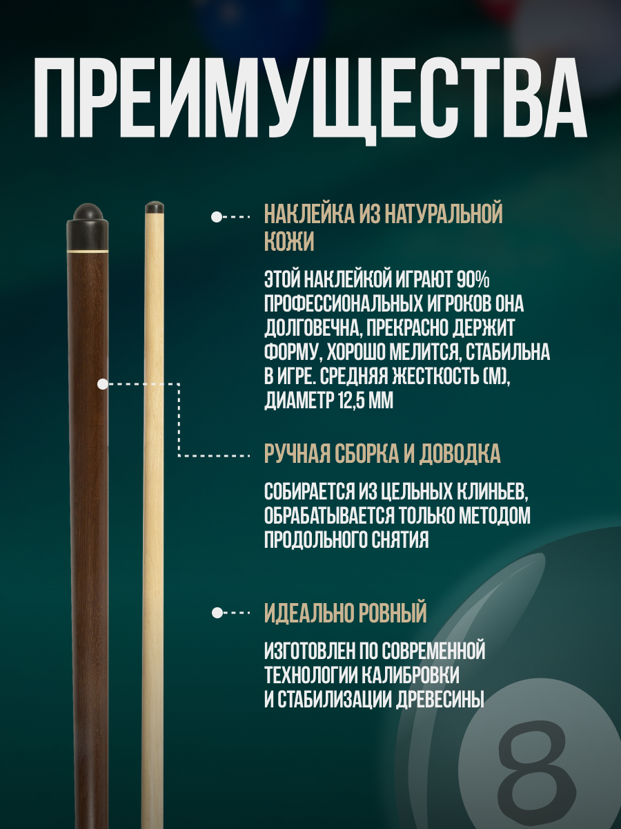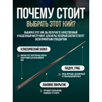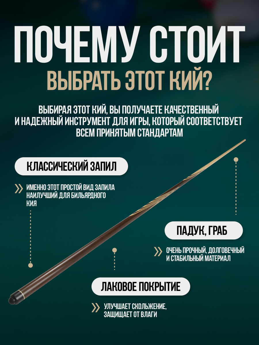 Разборный кий для русского бильярда ручной работы, длина 160 см. В конструкции двухсоставного кия используется один из самых популярных видов запила - классический. Прекрасный игровой инструмент для начинающих бильярдистов и для тренировок. Классический запил придает ему изысканный вид и неповторимую элегантность. Стильный и практичный деревянный кий станет неотъемлемой частью вашей игры, придаст уверенности в каждом ударе. Используйте этот бильярдный кий, чтобы сделать каждую партию особенной и захватывающей. Получайте удовольствие от игры и достигайте новых высот с этим великолепным кием! Благодаря разборной конструкции, кий будет особенно удобен для игроков, которые часто выезжают на турниры и тренировки, или предпочитают играть в клубах. Кроме того, цельные деревянные кии могут подвергаться деформации при изменении температуры и влажности. Составные кии могут быть более устойчивы к подобным факторам. После каждой игры протирайте поверхность кия и стакан салфеткой с применением специальных средств для избавления от грязи и меловой крошки. Для поддержания правильной формы и шероховатой поверхности наклейку следует регулярно обрабатывать. Храните деревянный кий для бильярда в подвешенном состоянии, вдали от источников света и тепла. Для транспортировки используйте подходящий чехол, кейс или тубус.