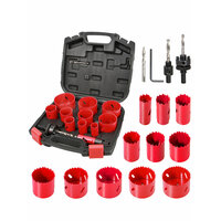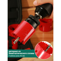 11 кольцевых пил и 6 аксессуаров: в том числе 11 пильных полотен размером: 20mm,22mm,25mm,29mm,35mm,40mm,44mm,51mm,57mm,60mm,68mm, максимальная глубина резания 40 мм, 2 оправки, 2 сверла, 1 запасное направляющее сверло для замены, 1 шестигранный ключ.
