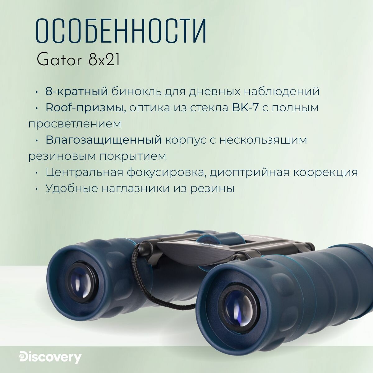 Перед вами туристический бинокль Discovery Gator 8x21, который удобно брать с собой на прогулки и в путешествия. Он небольшой и легкий, без труда помещается в рюкзак или сумку и не обременяет в дороге. Также он дает 8-кратное увеличение, что позволяет детально рассматривать сильно удаленные объекты, и обеспечивает хороший обзор. Поля зрения оптики вполне хватает для наблюдений за движущимися объектами, например спортсменами на стадионе или летящими в небе птицами.
