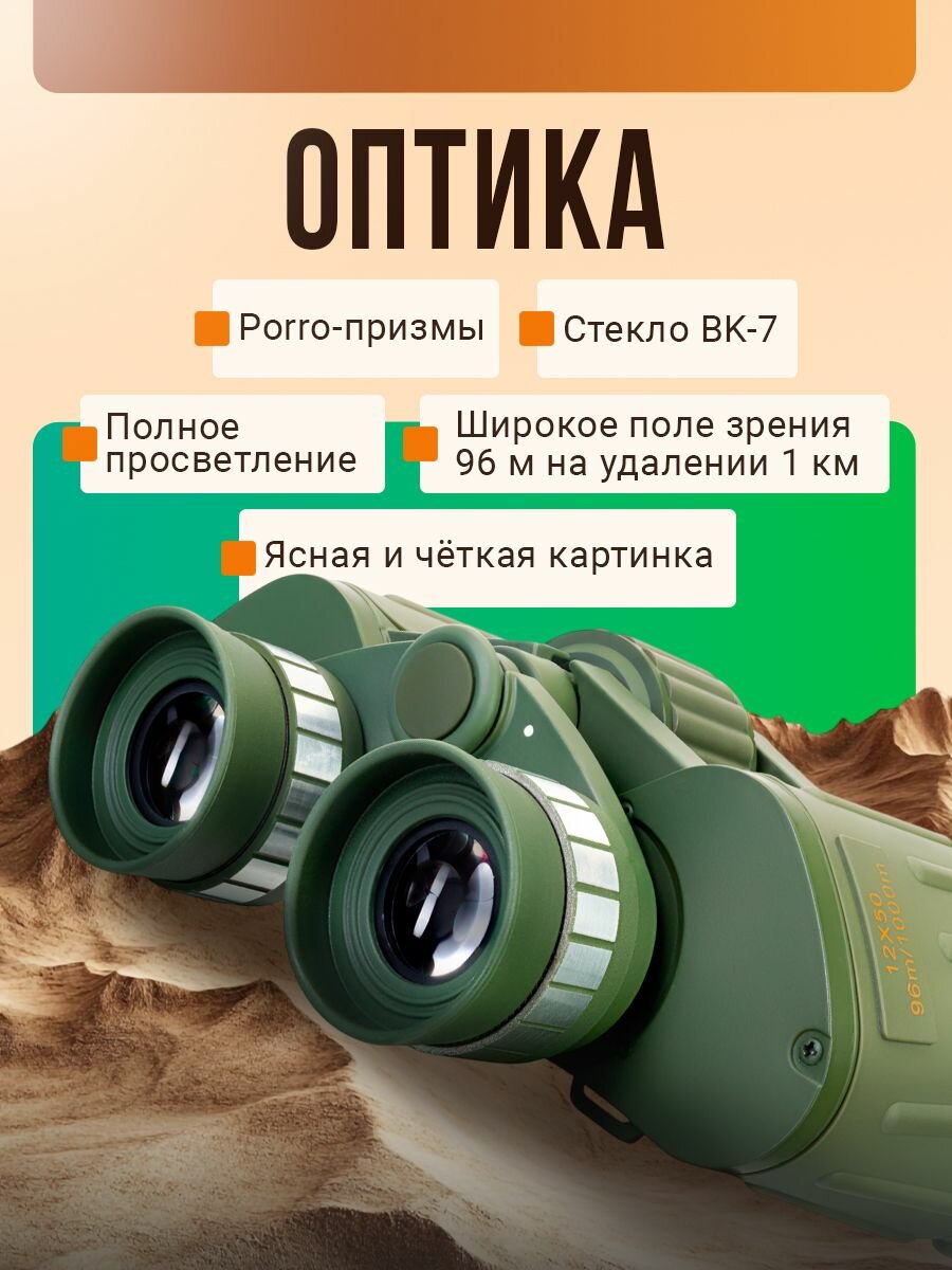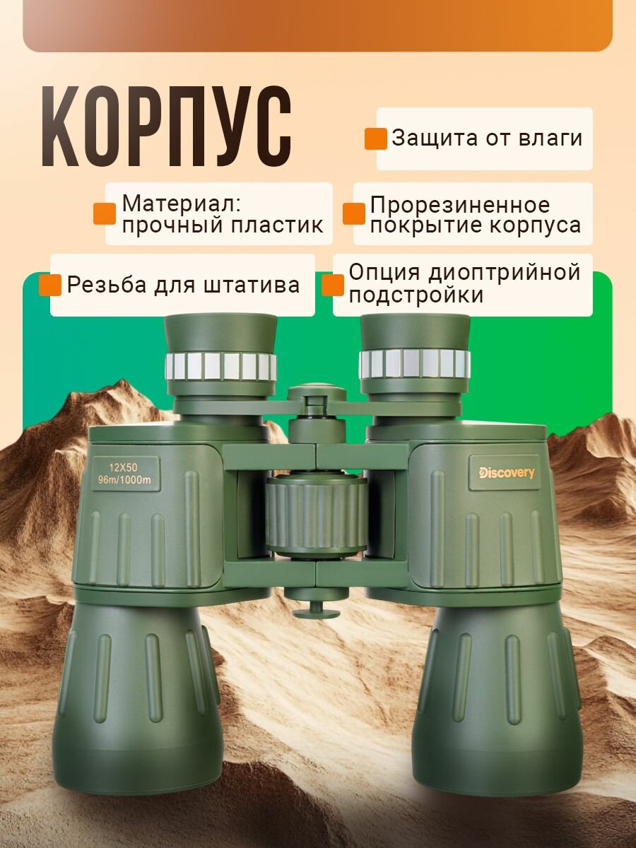 Оптика Discovery Field 12x50 изготовлена из стекла BK-7 и построена на призмах Porro. Для защиты оптики от влаги, пыли и ударов корпус прибора обрезинен, что дополнительно повышает надежность хвата. В качестве материала корпуса выбран прочный и одновременно легкий пластик. Настройка резкости выполняется с помощью барабана центральной фокусировки, который тоже обрезинен – регулировать фокус удобно даже рукой в перчатке. Если необходимо скомпенсировать разницу в остроте зрения на глазах, можно воспользоваться опцией диоптрийной коррекции.