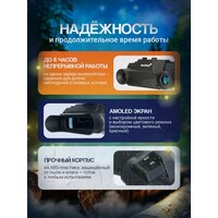 Экран прибора – AMOLED, с диагональю 2,7 дюйма и разрешением 240x536 пикс. Доступна запись видео со звуком на карту памяти microSD и последующее воспроизведение. Звук для видео неотключаемый. Разрешение видеозаписей – Full HD (1920x1080 пикс). Для удобства использования доступны 4 уровня яркости экрана и 3 цветовых режима: черно-белый, черно-зеленый и черно-красный.