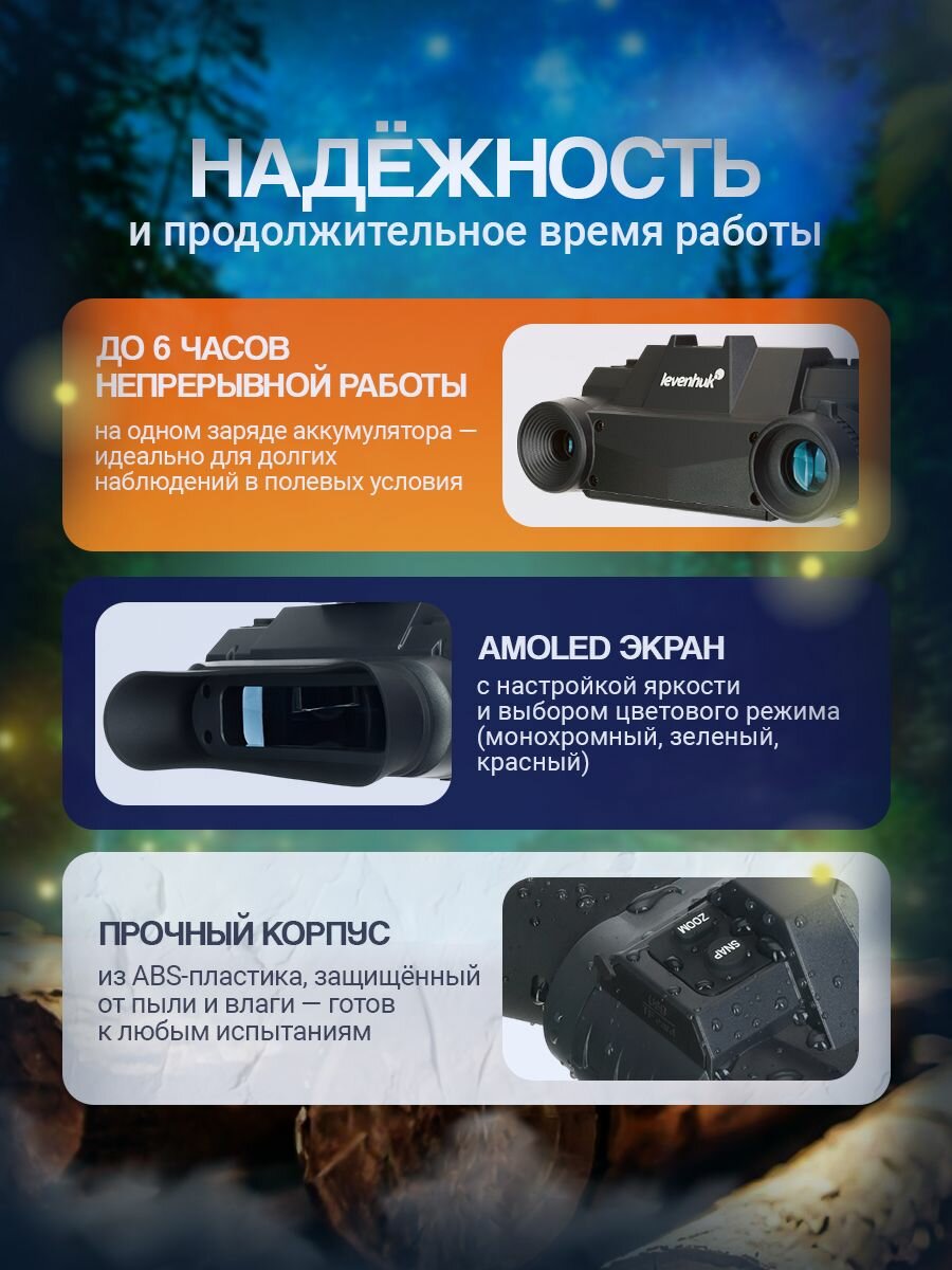 Корпус из инженерного ABS-пластика защищает прибор от попадания пыли и брызг. Два литий-ионных аккумулятора емкостью 700 мАч каждый обеспечивают бесперебойную работу бинокуляра в течение 2 часов при включенной ИК-подсветке и до 6 часов с выключенной подсветкой. Функция автоотключения позволит эффективнее расходовать энергию.