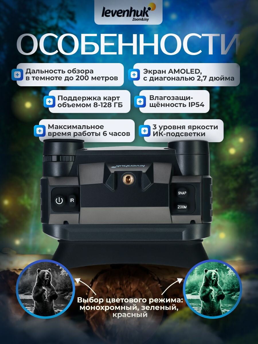 В основе действия прибора – сенсор CMOS 2,7" 2 Мпикс. В полной темноте и при слабом освещении (например, при лунном свете) он позволяет видеть на расстоянии до 200 метров. Дальность наблюдений в дневное время не ограничена. Диоптрийная подстройка позволяет скорректировать четкость изображения для пользователей с отхождением зрения от нормы.