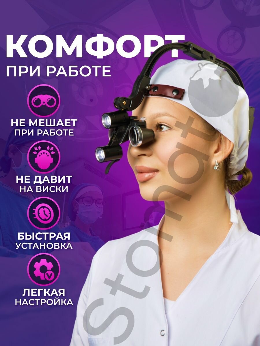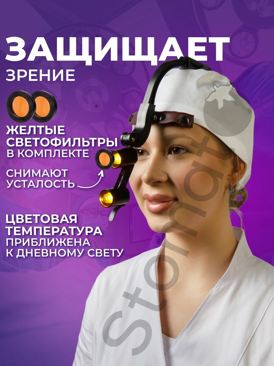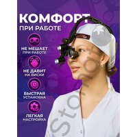 Бестеневая налобная двухточечная подсветка в комплекте с бинокулярами 3,5х и увеличительной линзой 1,5 х значительно повысят качество и комфорт ежедневной работы врача! Благодаря съемным элементам хирургические бинокуляры могут быть использованы в разных вариациях: 1. Как источник подсветки операционного поля; 2. Подсветка в связке с бинокулярами для увеличения объектов в 3,5 раза; 3. Налобный осветитель и коррекция начальной степени возрастной пресбиопии линзой +1,5. Революционная система с двухточечным упором обеспечивает меньше контакта прибора с кожей, меньше потоотделение, выше комфорт. Отсутствие неприятного давления на переносицу и виски, как в классической оправе, позволит увеличить продолжительность работы. Включение и выключение медицинского светильника происходит автоматически при опускании и откидывании фронтальной части с лампами. Два источника света мощностью 5Вт позволяют избежать появления теней от инструментов, исключают затвердевание композитного материала во время работы, снижают напряжение глаз и защитят зрение благодаря теплой цветовой температуре светильника ~5000К, приближенной к дневному свету. Для еще более теплой температуры в комплекте есть желтые светофильтры. При этом интенсивность света достигает 150000 люкс на максимальном режиме. У подсветки нет проводов, батарея является частью прибора. Вес снаряженного прибора с батареей и бинокулярами всего 218 г. В комплекте сразу 2 АКБ емкостью по 2000 mAh, каждый из которых обеспечивает время работы 4-5 часов, что позволит работать, не прерываясь на перезарядку (время полной зарядки до 5 часов). Правильное освещение стоматолога и необходимое увеличение сохранят осанку, здоровье и станут залогом высокого качества Вашей работы на долгие годы. Товар не является продукцией dr kim (доктор ким). Важнейшим параметром при выборе бинокуляров является рабочее расстояние или дистанция, в данных бинокулярах она 32-42 см при 100% зрении! В случае дальнозоркости рабочая дистанция увеличивается, а в случае близорукости уменьшается. Настройки медицинского светильника включают в себя: угол падения лучей света, ширину окружности головы, высоту лобной контактной площадки, яркость источников света LED. В комплекте: пластиковый шлем со встроенным двухточечным осветителем, 2 батареи, зарядное устройство; корректирующая зрение линза х1,5, бинокуляры х3,5, 2 желтых фильтра; кейс для хранения и переноски. 300203