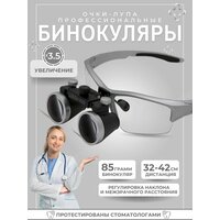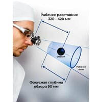 Профессиональные стоматологические бинокуляры очки-лупы системы Flip-up с увеличением 3.5x, обеспечивают четкую фокусную глубину обзора 90 мм в диапазоне рабочей дистанции 320 - 420 мм, а также имеют возможность регулирования межзрачкового расстояния. Фокусное расстояние рассчитано на людей со 100% зрением, в случае дальнозоркости оно увеличивается, а в случае близорукости уменьшается. Очень легкий вес 85 гр сделает процесс работы стоматолога, ювелира, косметолога более точным и комфортным, поможет снизить нагрузку на зрение, поддерживать правильную осанку во время работы, обеспечивая возможность видеть увеличенное изображение необходимых объектов. Данная модель протестирована в работе российскими стоматологами и получила наилучшие оценки. Шарнирный механизм позволяет поднять лупы вверх и продолжить работу, не снимая защитных очков в моменты, когда увеличение не требуется. Регулируемый шнурок обеспечит дополнительную фиксацию на голове. В комплект входят очки с бинокулярами, стильный переносный кейс в подарок, инструкция, дополнительное крепление для использования линз на своих очках, шнурок, салфетка для ухода за линзами. Для достижения наилучшего качества изображения рекомендуется произвести следующую настройку: 1. Настроить межзрачковое расстояние, для чего следует надеть лупу и с помощью регулировочного винта, расположенного в верхней части крепления лупы к оправе, совместить изображения в левом и правом окуляре до их полного слияния, на одном предмете. 2. Принять комфортное для себя положение. 3. Перемещайте объект вперед и назад, чтобы найти подходящее для фокусировки рабочее расстояние. Предмет должен находиться в центре поля зрения и быть четко виден во всех, самых мелких, подробностях. Меры безопасности: бинокулярная лупа предназначена исключительно для оптического увеличения объектов при обследованиях и операциях. Не рекомендуется смотреть через лупу на прямой солнечный или яркий искусственный свет. Не является медицинским товаром, может быть использован в целях обучения. Хирургические бинокулярные очки также отлично подойдут для работы с мелкими деталями и чтения мелкого шрифта, для ремонта электроники и часов, как бинокуляры для лор врача.