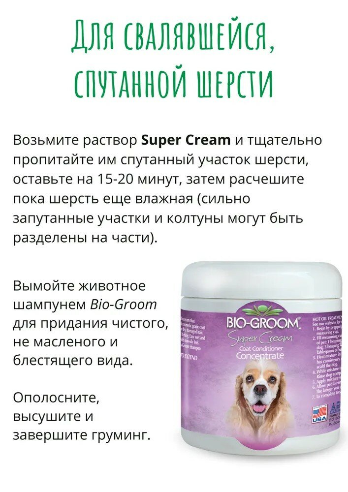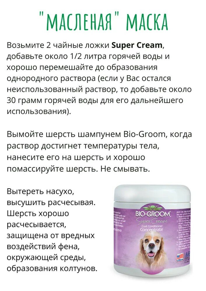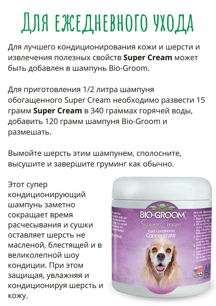 Super Cream™. Кондиционер "Супер-крем" Концентрация - высококонцентрирован Объем 227 г Этот кондиционер полностью соответствует своему названию. Зачастую достаточно 1/3 чайной ложки, чтобы довести шерсть до "Шоу - кондиции". Облегчает расчесывание. Многие владельцы ведущих питомники постоянно используют SUPER CREAM™ при груминге своих животных. Эта формула содержит масло зародыша зерна пшеницы, протеин, чистый витамин Е и другие специальные ингредиенты, которые кондиционируют шерсть, придавая ей здоровый блеск. Super Cream™ увлажняет, кондиционирует и насыщает кожу витаминами, предохраняя ее от сухости и облегчая последствия паразитарных покусов. Рекомендован для сухой, поврежденной шерсти. Super Cream™ Ph - сбалансирован, легко смывается с помощью любого BIO GROOM шампуня. Существует несколько вариантов использования в зависимости от того, какого эффекта Вы желаете достигнуть. Инструкция ПО применению Super Cream используется только в виде раствора, разводится в очень горячей воде (температура воды около 70 град по Цельсию). 1. Как сделать шерсть "масляной" - Возьмите 2 чайные ложки Super Cream , добавте около 50 мл горячей воды и тщательно размешайте до консистенции «густых сливок», при равномерном помешивании доведите количество воды в растворе до 1/2 литра. Вымойте шерсть одним из шампуней Bio-Groom и ополосните, когда раствор Super Cream остынет до температуры тела, нанесите его на шерсть и хорошо помассируйте шерсть. Не смывать. Вытереть насухо, высушить, расчесывая. Шерсть хорошо расчесывается, не колтунится, защищена от вредных воздействий фена, окружающей среды. Если у Вас остался не использованный раствор, то перед применением, разместите флакон в емкости с горячей водой и доведите температуру раствора до температуры тела, а затем проведите обработку шерсти. Помните, что при любой маслянной обработке необходимо перемывать животное на 4-5 день. В противном случае за счет налипания пыли и грязи на покрытый маслом волос можно получить обратный эффект, волос может стать ломким, начать сечься. 2. Для свалявшейся, спутанной шерсти: - Возьмите раствор Super Cream и тщательно пропитайте им спутанный участок шерсти, оставьте на 15-20 минут. Затем расчешите, пока шерсть еще влажная. (Сильно запутанные участки и колтуны могут быть разделены на части). Вымойте животное шампунем Bio-Groom для придания чистого, не масляного и блестящего вида. Ополосните, высушите и завершите груминг. 3. Для регулярного ухода: - Для лучшего кондиционирования кожи и шерсти и извлечения полезных свойств, Super Cream может быть добавлен практически в любой Bio- Groom шампунь. Для приготовления около 1/2 литра шампуня, обогащенного Super Cream, необходимо развести около 15 грамм Super Cream в 350 граммах горячей воды, добавить 100-120 грамм шампуня Bio-Groom и размешать. Вымойте шерсть этим раствором, сполосните, высушите и завершите груминг как обычно. Этот супер-кондиционирующий шампунь заметно сокращает время расчесывания и сушки, оставляет шерсть не масляной, блестящей и в великолепной Шоу кондиции. При этом защищая, увлажняя и кондиционируя шерсть и кожу. Не рекомендуется применять Super Cream в концентрированном виде – в этом случае невозможно обеспечить равномерность нанесения препарата на шерсть, и не исключена возможность передозировки витаминов, которые поступят через кожу. Сделано в США BIO-DERM Laboratories, Inc.