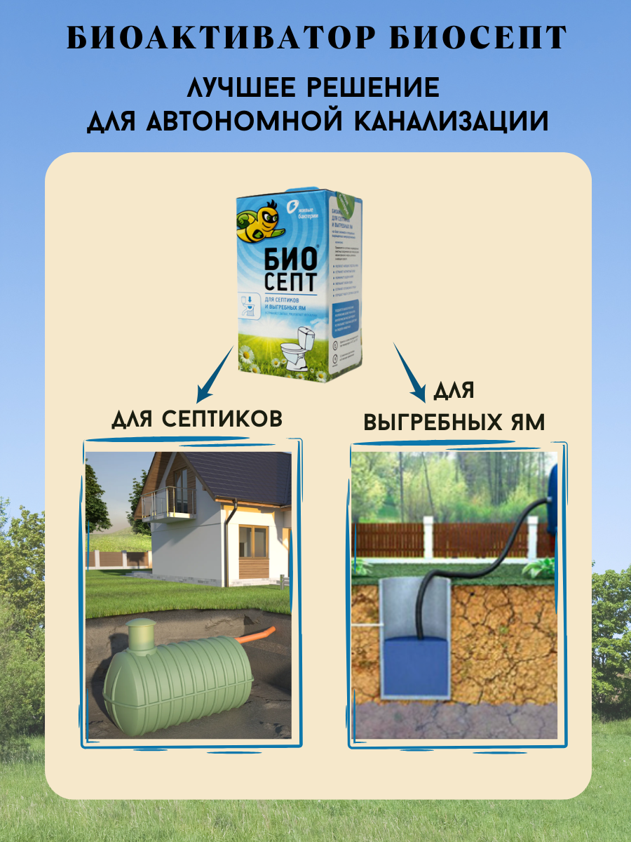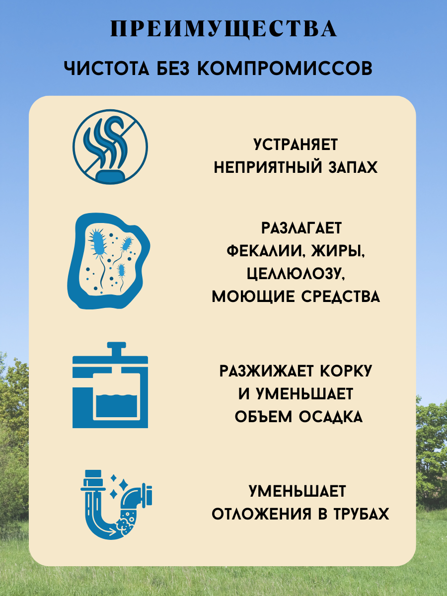 | Дополнительная информация | вес 1 пакетика 25 г; применение: высыпать содержимое пакетика в унитаз и смыть воду. При попадании в септик антибиотиков, хлора и др. токсичных веществ активность биоактиватора снижается |