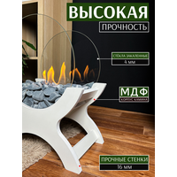 Биокамин изготовлен из дерева и стали, что обеспечивает его долговечность и надежность. В комплект входят 6 кг серых камней, которые придают камину эстетический вид и создают атмосферу уюта.