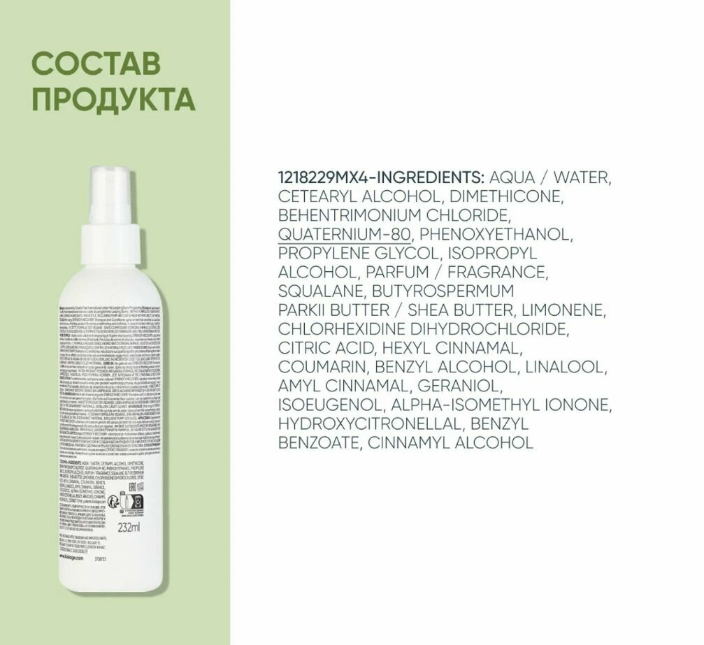 | Инструкция по применению | после использования шампуня и кондиционера, нанести спрей на влажные волосы и уложить привычным способом. Нанести на сухие волосы в качестве завершающего шага для дополнительного увлажнения и мягкости |