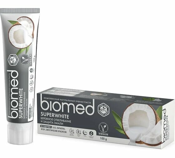 BIOMED супервайт зубная паста 100,0. гигиена полости рта Папаин, бромелайн, кокосовое масло, экстракт корицы, гидроксиапатит кальция, L-arginine, полифенолы подорожника и листьев березы, сочетание Dissolvine и сода. Бренд Biomed от Сплат. Продукты Biomed состоят из 98-99% натуральных ингредиентов и обеспечивают безопасный и эффективный уход за полостью рта для всей семьи. Наименование товараBIOMED SUPERWHITE зубная паста 100,0Форма выпуска Туба, 100 млВнешний вид:• Консистенция - пастообразная текстура• Цвет - белый, вкус - кокосовый. Состав: Специальные особенности: Не содержит: SLES, парабены, фтор, синтетические ароматизаторы и красителиБережное отбеливание и защита эмали. Отбеливающая зубная паста биомед супервайт с кокосовым маслом и экстрактом ананаса, содержащего бромелайн, для бережного осветления эмали чувствительных зубов. Здоровая белоснежная улыбка станет вашей визитной карточкой!24 компонента натурального происхождения:- 97% natural origin- Экстракт ананаса, содержащий бромелайн, обеспечивает очищение эмали от зубного налёта.- Фосфат кальция бережно полирует эмаль.- Кокосовое масло и экстракт корицы защищает от бактерий и придают пасте неповторимый пряный вкус- Ключевые компоненты - гидроксиапатит и L-Arginine - восстанавливают и укрепляют зубную эмаль, снижая чувствительность зубов- Природные экстракты: корицы, осины, стевии, листьев березы и подорожника обладают антибактериальным и противовоспалительным эффектом. Бикарбонат натрия бережно очищает и полирует зубную эмаль. Противовоспалительный эффект протестирован in vitro в лаборатории в Швейцарии. Результат: Клинически доказано: Очищающий эффект - 38,98%Кровеостанавливающий эффект - 63,64%. Реминерализующий эффект - 47,91%. Десенситивный эффект-97,11%*после 4 недель примененияОсветляет до 2 оттенков за 4 недели применения. Без фтора.
