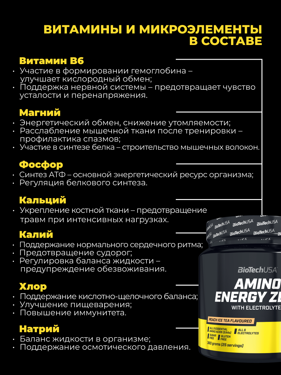 Как и все другие продукты BioTechUSA, Amino Energy Zero with electrolytes состоит из безопасных и тщательно подобранных ингредиентов.