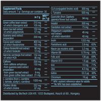 инулин, L-тартарат L-карнитин 17,1%, ароматизаторы, L-тирозин, порошок CLA 7,1% [глицериды (богатые CLA), сушеный кукурузный сироп, казеинат натрия (содержит молоко), антислеживатель (кремнезем) стабилизатор (фосфати калію)], экстракт семян какао (Theobroma cacao), пищевая кислота (лимонная кислота), ацетил L-карнитин 4,3%, инозитол 4,3%, холин цитрат 3,7%, зеленый экстракт кофейных зерен, экстракт семян гуараны (Paullinia cupana) (экстракт натуральной гуараны, кофеин), кофеин безводный 2,1%, экстракт плодов Garcinia cambogia, зеленый чай (Camellia sinensis), экстракт листьев корня крапивы индийской (Coleus forskohlii), кверцетин [из экстракта бутона дерева обычной пагоды (Sophora japonica), экстракт корня одуванчика (Taraxacum officinale) (экстракт одуванчика, мальтодекстрин), подсластитель (сукралоза), антислеживатель (диоксид кремния, магниевые соли жирных кислот), корни Polygonum cuspidatum, фумарат железа (II), оксид цинка, D-пантотенат кальция, никотиновая кислота, краситель ( Allura red AC3), пиридоксин гидрохлорид, цианокобаламин, птероил моноглутаминовой кислоты, хлорид хрома (III), йодид калия. 3Allura red AC: может негативно влиять на активность и внимание детей! Изготовлено на предприятии, которое производит также продукты, содержащие молоко, яйца, глютен, сою, ракообразных, диоксиды серы и орехи.