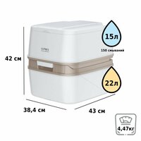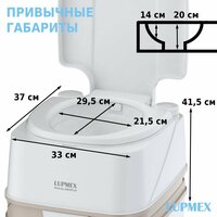 Биотуалет LUPMEX – простое и функциональное решение при отсутствии стационарной канализации. В модели есть бак для чистой воды на 15л (150 смываний), а также большой бак для отходов на 22 л с индикатором заполнения.