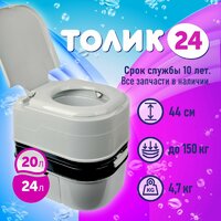 Портативный биотуалет толик 24 состоит из двух пластиковых ёмкостей, соединённых защелкой. Верхняя – резервуар омывающей жидкости (20 л), унитазная чаша с сидением (стульчак) и крышкой, а также помпа для смыва. Нижняя ёмкость имеет отсекающий клапан-задвижку, обеспечивающий герметичность (в отличие от ведра-туалета неприятные запахи исключены), а также специальные отсеки для хранения туалетной бумаги, прочих принадлежностей и поворотный патрубок, облегчающий опорожнение ёмкости.