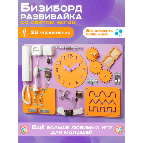 Бизиборд "Мастерская бизибордов Развивайка" Стандарт 60х40 см выполнен в ярких фиолетовом и оранжевом цветах, что делает его привлекательным для детей. В комплекте 22 детали, упакованных в коробку, что обеспечивает удобство хранения и транспортировки.
