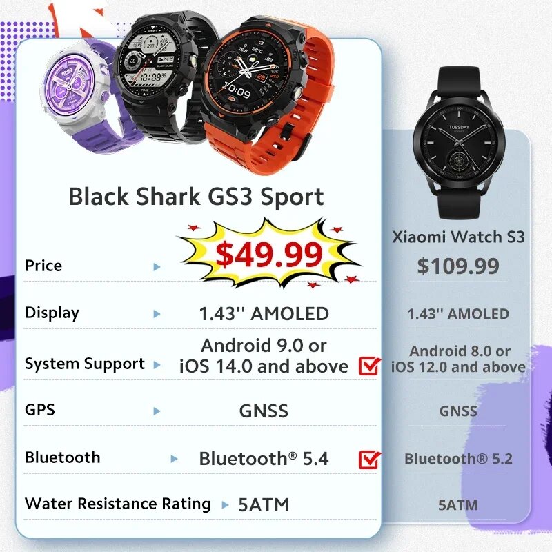 Black Shark GS3 Sport Smart Watch Лавовый черный, Mist Black: сравнение цен, характеристики, фото, актуальное наличие и цены.