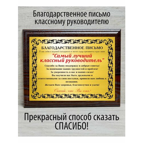 Чтобы сказать спасибо человеку, который не один год вкладывал в вас душу, свои силы и свою любовь и повод не нужен, а уж если он есть, благодарственное письмо – это именно то, что нужно. Именно теплые и нежные слова, зачастую и являются самым желанным подарком от вас, и знайте, этому подарку будет выделенно самое лучшее место в доме! Благодарственное письмо классному руководителю выполнено на солидной деревянной плакетке (ламинированный МДФ) с печатью на золотом металле.