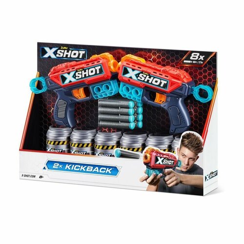 Набор бластеров «Дабл Кикбек» от Zuru X-Shot — это двойная отдача! Можно поделиться оружием с другом и устроить захватывающее сражение. Компактный и динамичный, он отлично лежит в руке. Дополнительное крепление для двух стрел на корпусе позволит быстро произвести перезарядку. Дальность выстрела — до 27 метров. В комплект входит 8 пулек и 6 мишеней в виде банок. Подойдет детям от 3 лет.